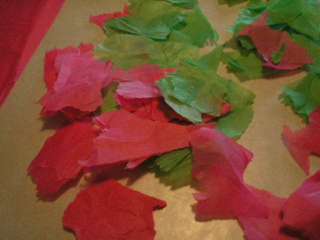 NEXT, tear (just rough rips) small pieces of tissue paper. You don’t want straight, scissors cut lines here.