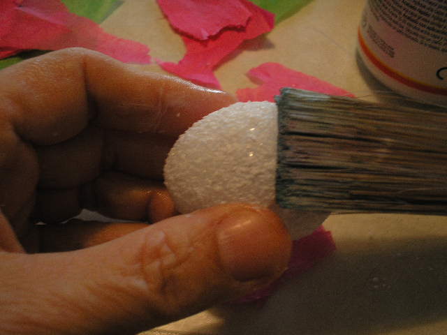Now, Lightly moisten tip of paintbrush, squeeze out excess water, dip tip of brush in modpodge and begin applying to BOTTOM of egg.
