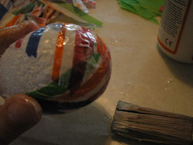 Now push skewer into this area of your egg. The stick gives you something to hang on to and makes the rest much easier to finish. Then just keep going, gluing and smoothing layers of tissue until egg is covered.