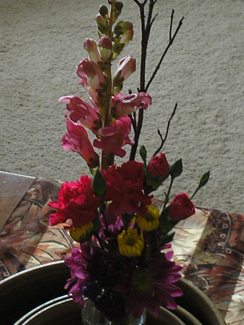 Back before the BIG FALL, I purchased an assorted bunch of flowers at WalMart for $7.99. The mixtures are versatile because divided up, they make several smaller bouquets, for more color around the house.