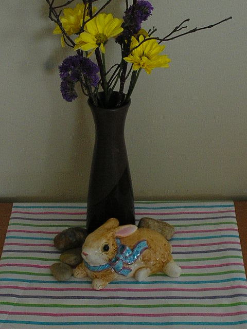 Above, I used the single frond of greenery and added daisies, small mums and purple stasis to a wide mouth vase. A cute bunny figurine and some pretty paper drape, brightened up my credenza.