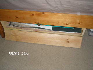 I did design & Hubs built, a special size storage area attached to the bottom of the twin bed frame. It’s just a simple attached drawer with a little hook to close it.